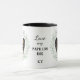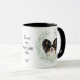 "LOVE MY PAPILLON DOG" declares this mug for the Papillon dog owner. Each side of the mug has a portrait of an adorable little black and white Papillon framed by soft green watercolor eucalyptus leaves. Between the two images is the text, which may be easily customized, or even removed by you, and your monogram or name.