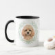 "LOVE MY POODLE" declares this mug for the Poodle dog owner. Each side of the mug has a portrait of an adorable little Poodle dog framed by soft green watercolor eucalyptus leaves. Between the two images is the text, which may be easily customized, or even removed by you, and your monogram or name.