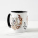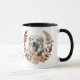 Uma bonito coroa de outono em tons de cinamão marrom, bronzeado e creme rodeia a imagem aquosa de um lindo Cão Pirenéus Excelente branco. A imagem é impressa duas vezes na caneca, com seu texto personalizado entre eles.