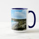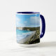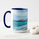 Imagem é uma vista maravilhosa de uma praia com areia branca, águas do mar azul aqua e penhascos de ascensão