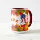 Um design de queda muito colorido com folhas e abóboras, e o banner do Star-Spangled voa orgulhosamente. As letras USA aparecem na parte de trás da caneca.