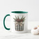 Cones de pinho e ramificações de pínus em uma cesta de Xadrez de Buffalo, fazenda de Whimsical, abrigam caneca de café de Natal.