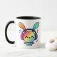 Caneca Feliz Bunny com fones de ouvido ouvindo música.
