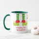 Esta é uma caneca divertida para a época de Natal! Ele apresenta uma imagem de meias verdes listradas e calçados de elfo em cada lado, com o texto vermelho abaixo que diz "Prendendo os Misturos". No centro está um campo de texto personalizado em vermelho que diz atualmente "Feliz Natal", mas você pode mudar para qualquer coisa que quiser. Bonita, e definitivamente ganhará alguns sorrisos de férias! *Crédito de Design para Prettygrafikdesign.