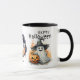 Aqui está uma linda caneca de Halloween para crianças que é mais divertida que assustadora. Um fantasma feliz veste o chapéu de uma bruxa negra e fica ao lado de uma lanterna laranja. Acima dele está um texto que diz "Feliz Dia das Bruxas". A imagem é impressa duas vezes na caneca, com outra imagem fantasma flutuante feliz entre elas. O nome do seu filho está no centro. Apropriado para crianças de todas as idades.
