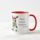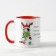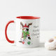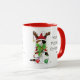 Gato calico giro vestido com luzes de natal, chifres recheados, chapéu de Natal, e um grande arco verde contra um pano de fundo verde-claro, O gatinho não está feliz!