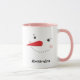 Café de férias bonito/caneca de cacau quente apresenta um rosto feliz de boneco de neve de inverno com bochechas rosadas quentes, nariz de cenoura, olhos e sorriso feito de carvão. Cor de design branco de neve, preto, rosa e laranja. Personalizar com um nome ou outro texto personalizado.