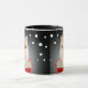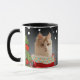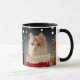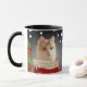 Gato de Angora em um saco de férias de veludo vermelho contra fundo escuro.