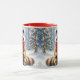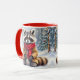 Uma xícara de café de Natal super fofa que tem uma ilustração do estilo aquarela ai de um guaxinim festivo sentado numa floresta de neve branca durante um dia de inverno com um pano de fundo de pinheiros decorados em férias.