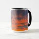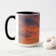 Esta foto é de um pôr do sol de aparência muito intensa. As cores laranja vibrantes misturadas com as nuvens de cor roxa-escura dão-lhe a aparência de fogo e fumaça.