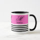 Uma elegante e elegante risca negra e branca apresenta uma letra de caligrafia clássica e dramática. Com a fita rosa vibrante para personalizar seu nome, esteja você desfrutando de uma manhã bem agradável em casa ou usando um dia de trabalho de busto, esta caneca é perfeita para ajudar a permanecer quente e focada. Excelente item de presente para você mesmo ou um presente para amigos e familiares ou aqueles que procuram algo único.