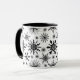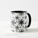 Esta é uma linda caneca com um padrão de floco de neve em preto sobre um fundo branco. Aproveite suas bebidas quentes nesta caneca festiva.