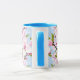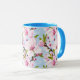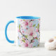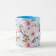 Uma caneca combo adornada com delicados ramos de flor de cerejeira em tons suaves de rosa e verde sobre um fundo azul sereno, trazendo um toque elegante e calmante para o café ou chá da manhã. Uma escolha refinada e pronta para presente para amantes da natureza e fãs de design floral gracioso.
