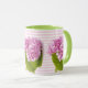 Decorem sua cozinha para a época de primavera e verão com canecas de café impressas em flores. Esta caneca de café apresenta um fundo pastel, cor-de-rosa e listrado branco, com uma camada de flores cor-de-rosa, hydrangea. Comprar para você ou dar como presente para aquele especial. A combinação de cores com flores bonito faz dessa caneca um presente perfeito para o Dia de as mães ou outra ocasião.