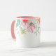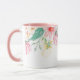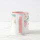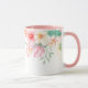 Esta caneca floral tem lindas imagens pastéis de flores em torno da borda superior da caneca. A amostra do interior mostrada é rosa.