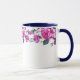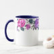 Esta caneca floral tem rosas roxas e rosadas com folhas esmeralda verde-mar ao redor da borda superior da caneca sobre um fundo branco. A amostra de interior mostrada é azul escuro. Escolha a cor do interior para combinar com o seu gosto. Personalize esta caneca ou compre como projetada.