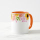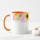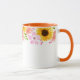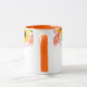 Esta caneca floral de duas cores tem lindas flores de verão, como rosas silvestres cor-de-rosa, papoulas coral e girassóis alegres em torno da borda superior da caneca. A alça e o interior mostrados são laranja.