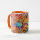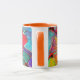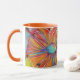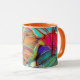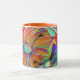 O design digital de Julie Richman nesta caneca abstrata artística colorida é essa de uma obra de arte amável que possa ser apreciada cada dia com um copo da manhã do chá ou do café. A ideia para esta imagem veio aproximadamente devido à imaginação da fantasia sobre flores do cubist. A caneca é colorida alegre com cores verdes da laranja, as roxas e as azuis.