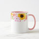 Esta caneca floral de dois tons tem flores bonito de verão de rosas selvagens cor-de-rosa, corais e girassóis tortuosos ao redor do topo da caneca. O manípulo da amostra e o interior mostrados são cor-de-rosa.