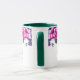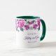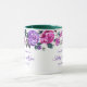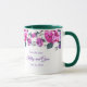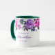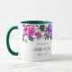 Esta caneca floral tem rosas roxas e rosadas com folhas esmeralda-verde-marinho em torno da borda superior da caneca sobre um fundo branco. Texto roxo aguardando personalização. A amostra do interior mostrada é verde. Escolha a cor do interior para combinar com o seu gosto. Personalize esta caneca ou compre como projetada.