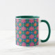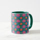 Uma bonito Praga de Café, com um Lip e Alça Verde Caçadora e um padrão colorido de Flores Vermelhas e Rosa e Bolinhas Amarelas em um Fundo Azul Profundo e Verde. Parte da coleção Posh & Painterly 'Rangoli', este padrão pode ser ajustado para ajustado qualquer Mug de Café.