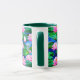 Mágula de café num padrão de flores cor-de-rosa florescente e lágrimas verdes e luxuosas flutuando em uma superfície de água azul e texturizada, em tons de joia de rosa e esmeralda verde