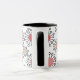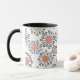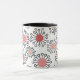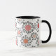 Esta caneca tem um médio moderno século design de flores feitas de círculos em tons de rosa, anango, bege e e linhas pretas.