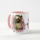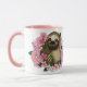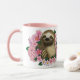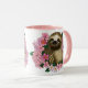 Uma preguiça bonita sentada entre flores cor-de-rosa contra um pano de fundo azul