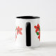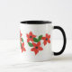 Uma caneca de café branca na moda com uma jante preta e alça e aglomerados de flores vermelhas, de um design de colagem de papel pintado à mão por Judy Adamson.