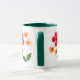 Uma caneca branca-chic com lábio e punho verdes, decorada com um design floral vermelho, verde e amarelo, de uma colagem de papel pintado à mão por Judy Adamson.