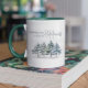 Esta design apresenta uma elegante caneca de Natal, com uma cena de floresta aquática um tradicional design de moda, elegante roteiro caligráfico, com inverno sazonal, cenário verde-arborícola, perfeito para a ideia de presente de amantes do café festivo, uma ilustração tradicional, simples minimalista, desenho de pinheiro.