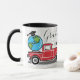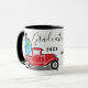 é o presente perfeito para o amante de caminhoneiros vintage na sua vida. Esta engraçada design apresenta um carregando vermelho de picup em um grande mundo vestindo um boné preto de formando. À direita lê-se "Formando" com o ano, seu grau e um nome para você personalizar. O fundo é uma cinza e uma camada de mapa branco representando o mundo. Concebido pelo artista mundialmente famoso ©Tim Coffey.