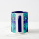 A caneca combo azul abstrato apresenta arte fractal em cores vibrantes (azul, ciano, verde e roxo).