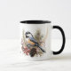 Esta é uma caneca bonito para qualquer um, com a imagem de uma pequena galinha picante, tocada num galho com pinho e bagas vermelhas. Por trás das imagens de pássaros está um rastro de uma espiral de ouro. A imagem é repetida duas vezes na caneca, com seu nome em preto entre elas. Uma bonito cena para qualquer estação!