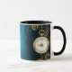 Turquesa, texturizada, fundo steampunk com latão e engrenagens douradas, chave prateada e relógio. Estilo Steampunk.