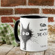 "Melhor Fazer a Mina De-Caf" diz esta caneca de café com uma engraçada imagem de gato preto estressado em dois lados. O texto, juntamente com o seu nome, está no meio entre as imagens.
