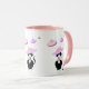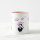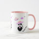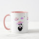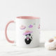 Caneca fofa com um gato smoking de sorte e um padrão de discos voadores. O texto no lado direito pode ser personalizado.