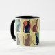 A caneca de café em nove gatos estilizados, arranjada em um padrão de grade, cada um se posiciona contra diferentes colorido. Os gatos apresentam cores casaco e padrões variáveis, dando a cada um uma uma aparência única