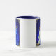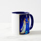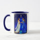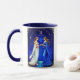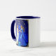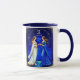 Mug em duas mulheres etéreas representando o sinal de zodíaco Gemini. Vestidos com elegantes vestidos brancos e azuis, eles se espelham, segurando as mãos sob um céu noturno estrelado. O símbolo Gemini aparece acima deles evocando harmonia celestial e dualidade.