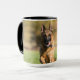 Um cachorro German shepherd revestido de vermelho corre alegremente ao ar livre.