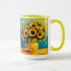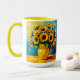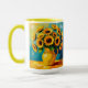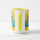 Uma linda caneca de café personalizada com uma bela ilustração de um girassol amarelo em um bonito vaso amarelo feito em estilo impróprio.