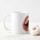 Uma boca aberta grande e dentes na parte dianteira desta caneca de café.
