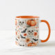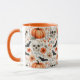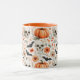 Uma charmosa e pintada manualmente caneca padrão de Halloween com abóboras, crânios, morcegos e flores de outono. Um acessório de férias de excelente.
