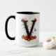 At the base of the 'V', resting on a dark, rocky surface, is a cluster of five more brightly lit jack-o'-lanterns, all carved with different, spooky faces. Several black bat silhouettes are visible, flying around the 'V' and the moon, completing the classic Halloween motif.