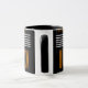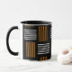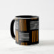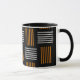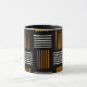 Esta caneca tem uma design moderna do século médio que se parece com uma tecelagem com linhas laranja e branca num campo de preto.