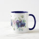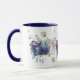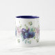Uma linda e graciosa caneca de impressão floreada para café à volta da mesa. A banda encantadora das flores é de cor d'água azul profunda e flores de hidrangea roxas com delicadas folhas cintilantes, intercaladas com duas rosas prateadas cor-de-rosa maior e pequenas rosas brancas pequenas em volta da borda e do fundo.