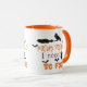 a caneca engraçada do café Costum para o Halloween apresenta um design decorativo moderno de laranja e tipografia negra com bruxa voadora e morcegos ao redor.