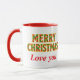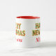 Fun thoughtful holiday coffee mug with Merry Christmas on one side and Happy New Year on the other with area for a special message. Lettering in festive red and green geometric pattern outlined in gold.