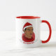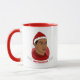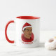 Caneca de Natal com ilustração de um homem afro-americano ou hispânico de cabelo preto curto e chapéu vermelho de Papai Noel; em círculo vermelho de fundo branco, com modelo de texto personalizável para seu nome ou mensagem