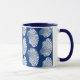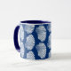 Mug em um padrão de impressão de bloco, baseado em um invólucro de couro cabeludo, em branco sobre um fundo azul de cobalto / marinho
